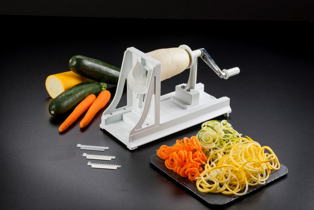 Der Spiralschneider kann Lebensmittel mit einer Länge von bis zu 170 mm und einer Breite von 100 mm verarbeiten. Das Gerät ist für die Reinigung leicht zu demontieren.